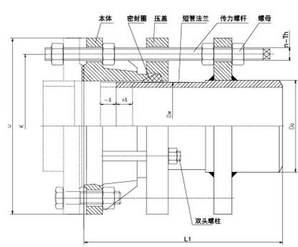 松套传力接头是在法兰松套补偿接头的基础上增设法兰短管及传力螺杆而成,次类型的补偿接头与松套补偿接头和松套限位补偿接头不同的是它的补偿量是指在安装及拆卸过程中的调节量,一旦将所有的螺母拧紧,它是刚性连接的,可以传递轴心力,从而保护阀门、泵等设备。